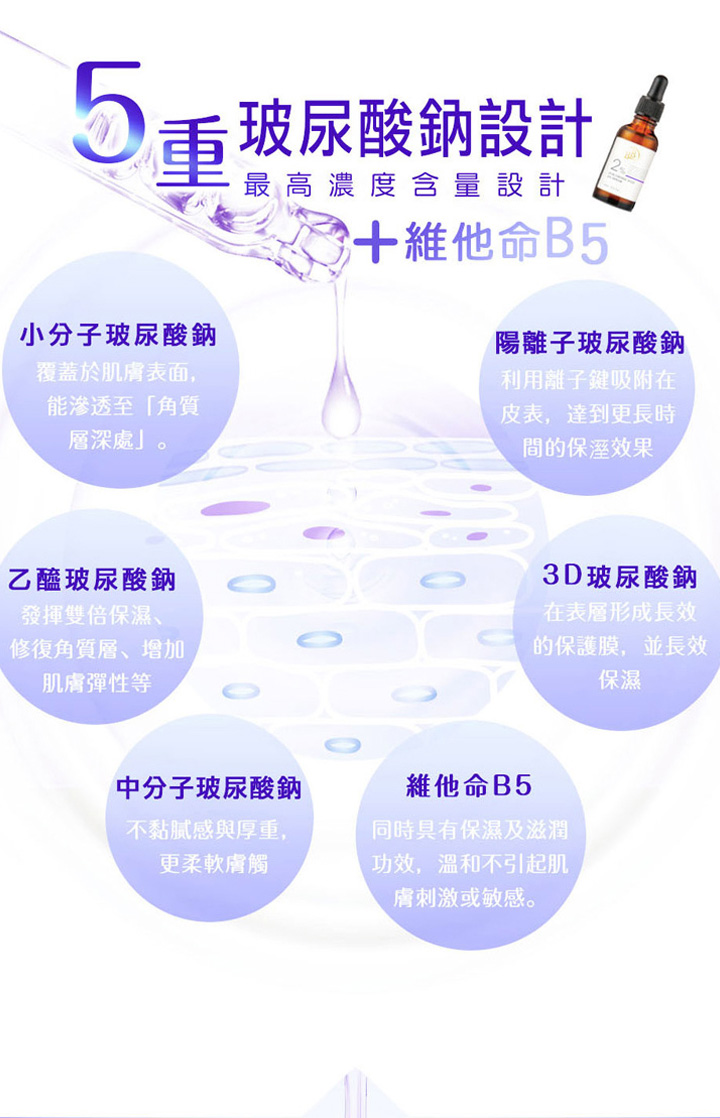 ●配合5重玻尿酸,結合中小分子及特殊作用的陽離子玻尿酸及3D玻尿酸,