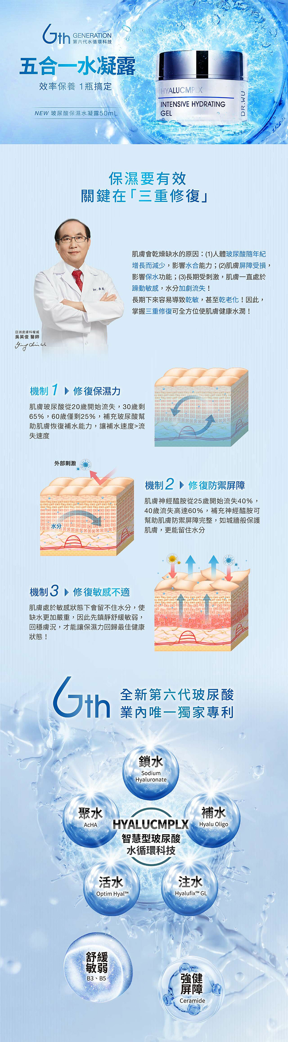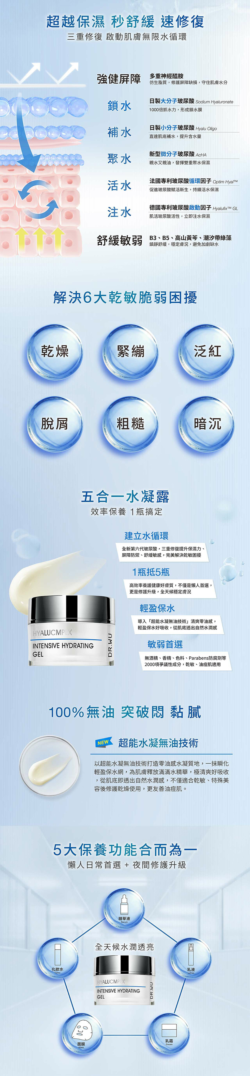 1瓶集結化妝水、精華液、乳液、乳霜、面膜5大功能,以獨家第六代「智慧型玻尿酸水循環科技」完美結合5重玻尿酸,達到鎖水、補水、注水、活水、聚水,修復自我補水力,搭配多重神經醯胺與B3、B5舒緩修復。更導入「超能水凝無油技術」打造100%無油配方,一抹瞬化輕盈保水網,能急效補水、長效保水、密集修護,穩定全天候膚況,不僅是懶人日常首選,更是夜間修護升級,緩解因日曬或熬夜壓力造成的乾燥缺水,高效率養護健康好膚質。