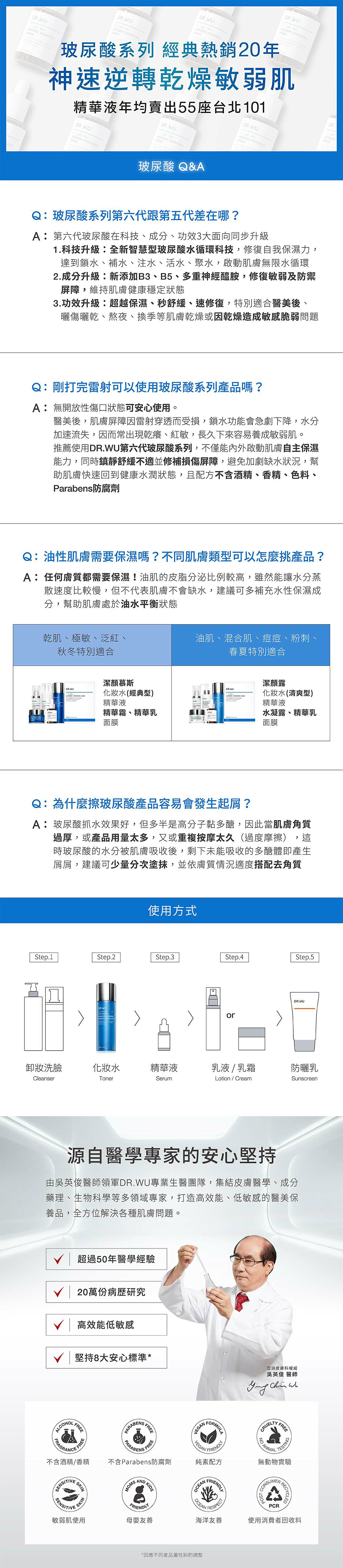 ■主要成份:大分子玻尿酸、小分子玻尿酸、玻尿酸循環因子、玻尿酸啟動因子、微分子玻尿酸、菸鹼醯胺(B3)、維他命原B5、五重神經醯胺、複合胺基酸、鎖水磁石、醣基海藻糖、複合多醣藻