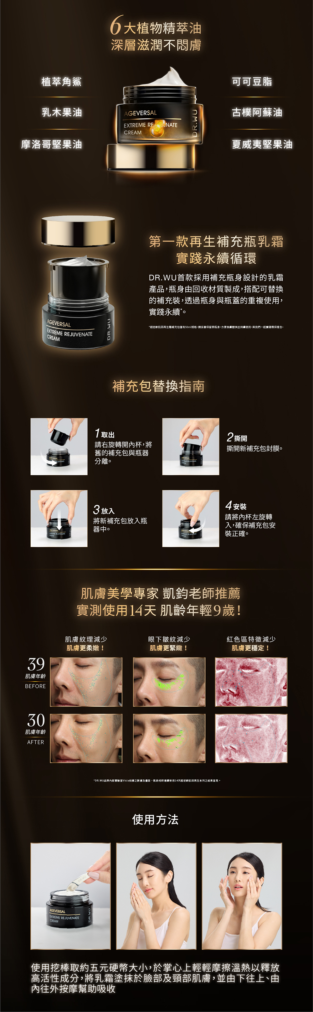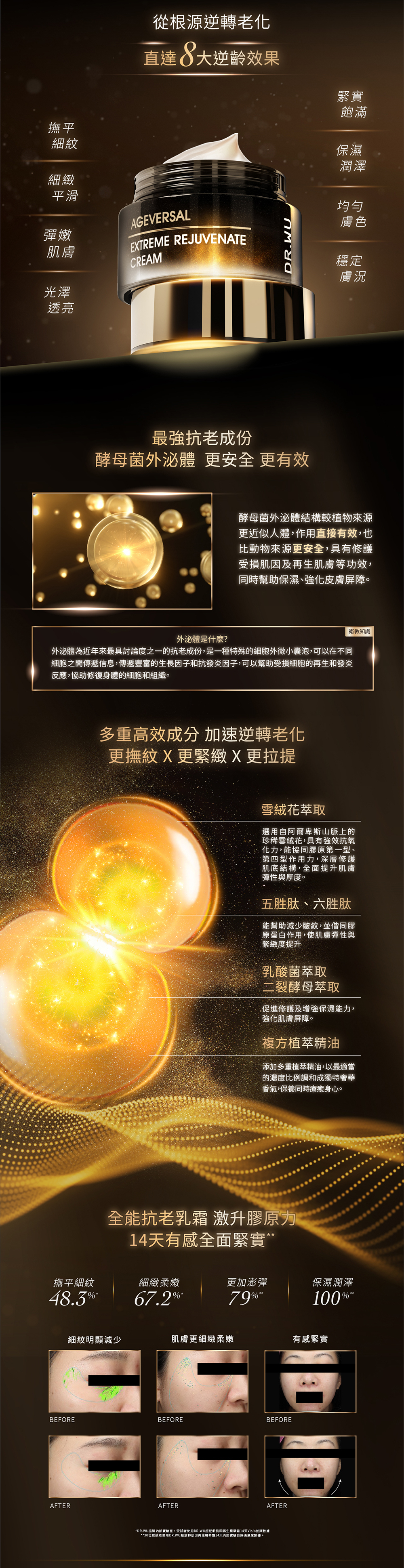 全面激活膠原力,緊實雕塑更年輕,獨家「超逆齡肌因再生科技 AGEVERSAL」,結合再生醫學理論,導入「煥新、修復、賦活」機制,從根源解決老化狀況,代謝老廢肌因,並提升肌因自我再生力及修護力,全面啟動肌因再生,賦活肌膚年輕狀態。最高濃度雪絨花精粹*精華霜,取自阿爾卑斯山脈嚴峻氣候生長雪絨花精萃,具有強效抗氧化力,協同膠原蛋白第一型、第四型作用力,深層修護肌底結構,點.線.面撐起臉部核心,提升肌膚彈性與厚度,實現從內而外澎潤彈嫩!更添加以法國頂級植萃角鯊為首6大植萃油,以深度滋潤保濕,使肌膚由內而外綻放年輕光采,深層滋潤不悶膚,雕塑完美輪廓線!