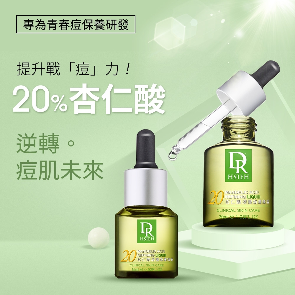 完美黃金比例配方,蘊含20%高活性杏仁酸+積雪草+水飛薊+印度醋栗抗氧化劑,透過20%濃度及杏仁酸用法,全方位深入毛孔代謝角質,減少毛孔阻塞,平衡油脂分泌,改善毛孔粗大,全面痘痘粉刺清除超有感!