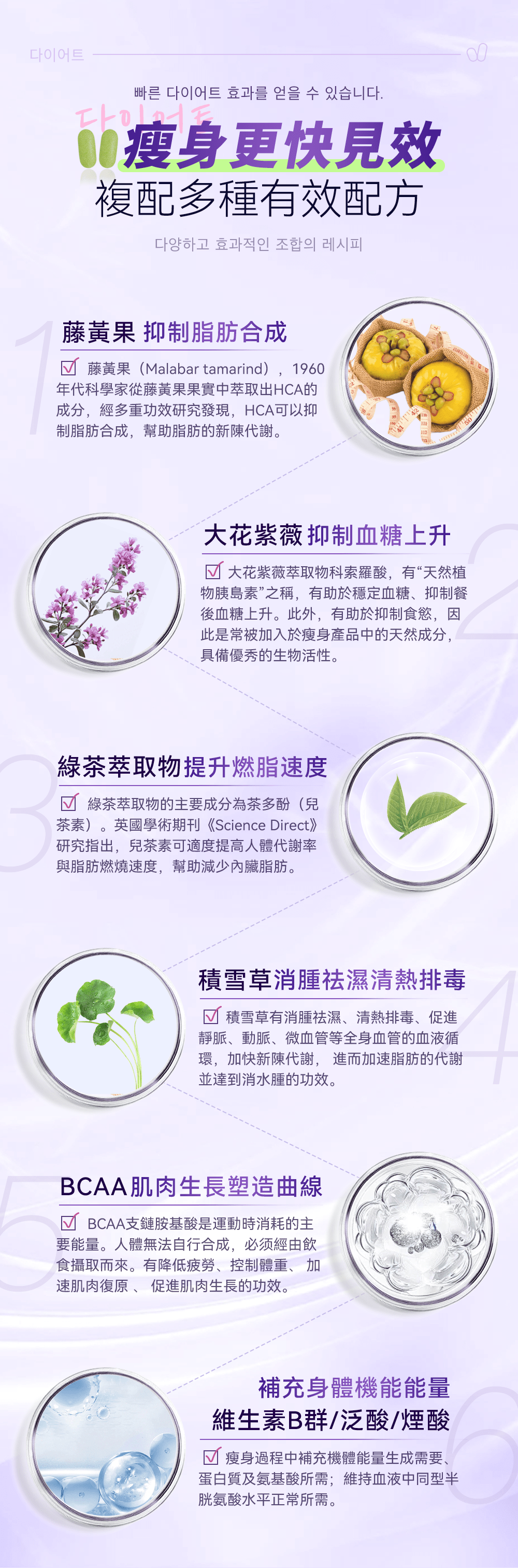 綠錠:藤黃果提取物、大花紫薇提取物等,加強減脂效果並補充身體的營養,抑糖,緩水腫,增肌