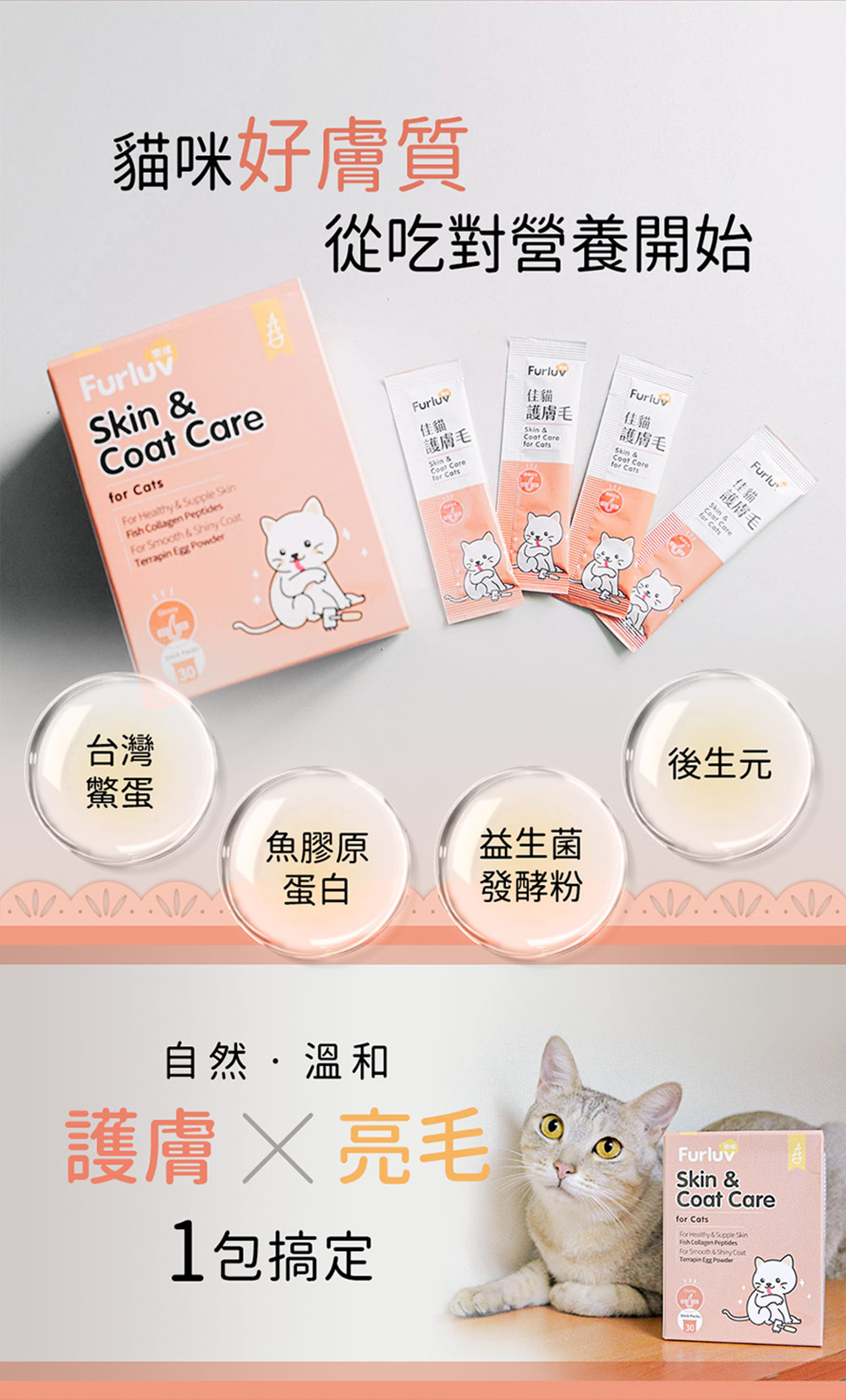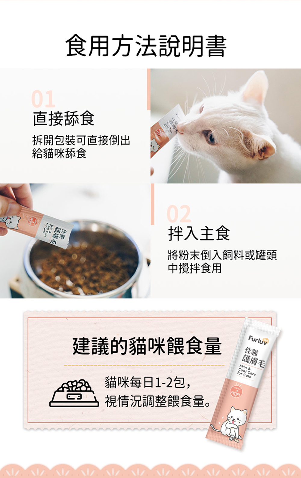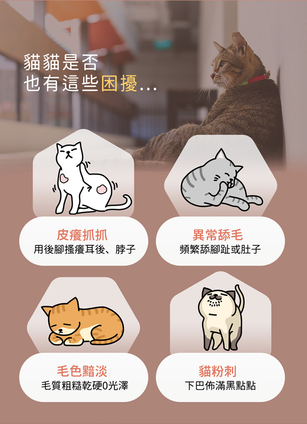 補充有益膚毛的營養,維持貓咪良好膚況與光澤亮毛。