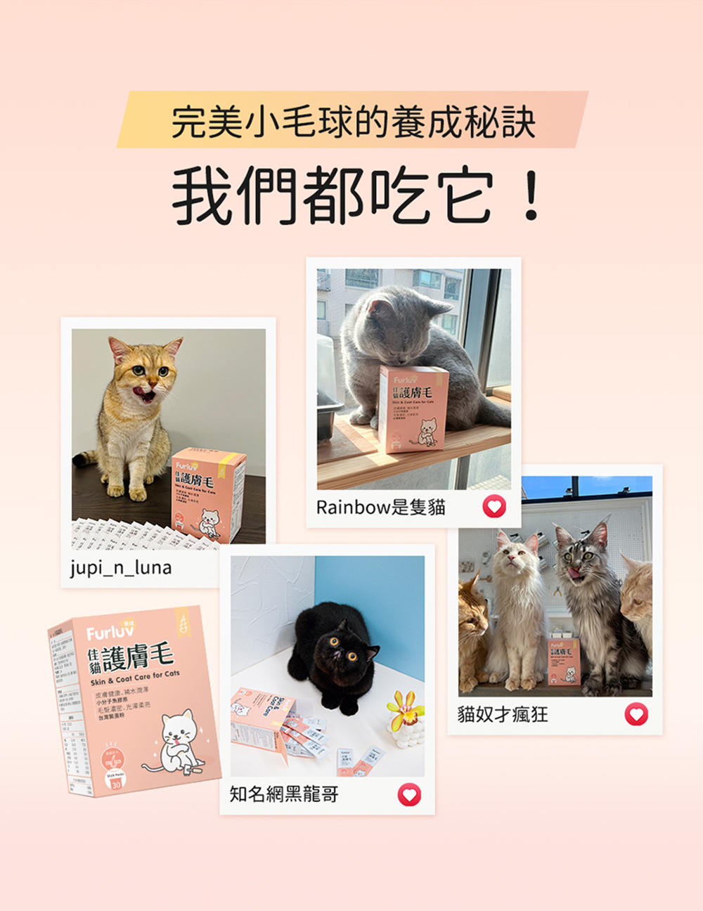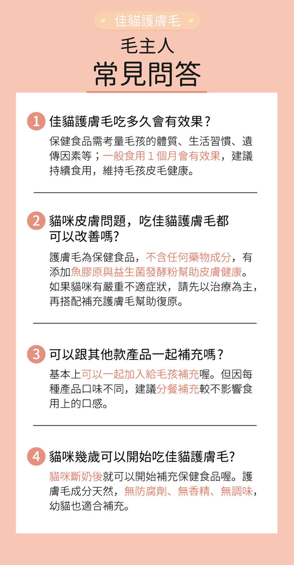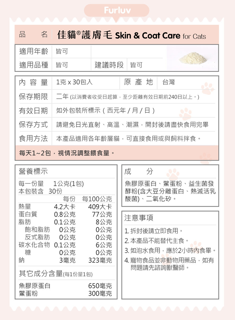 補充有益膚毛的營養,維持貓咪良好膚況與光澤亮毛。