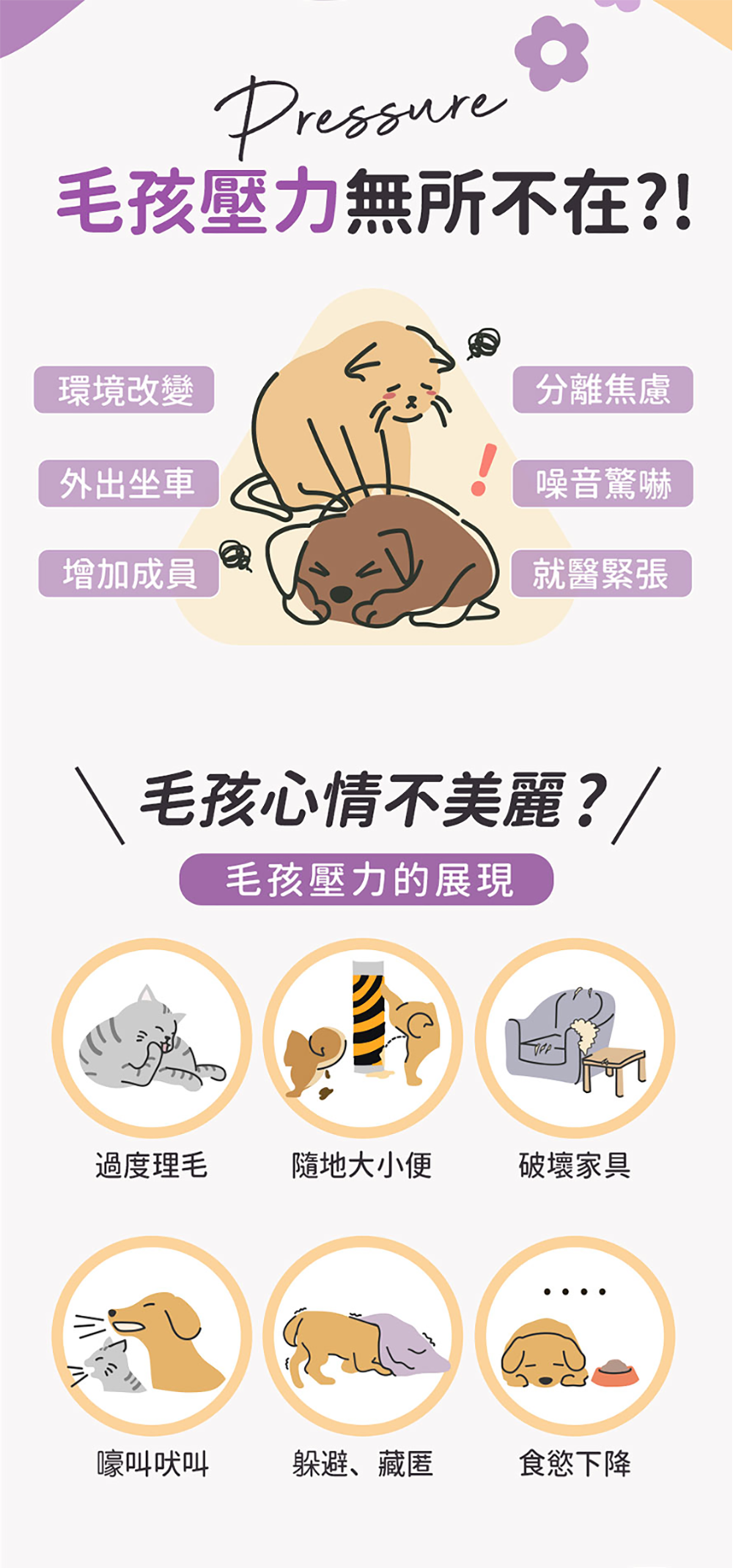 毛孩有過度理毛、隨處便溺、破壞家具、食慾下降等困擾嗎?
