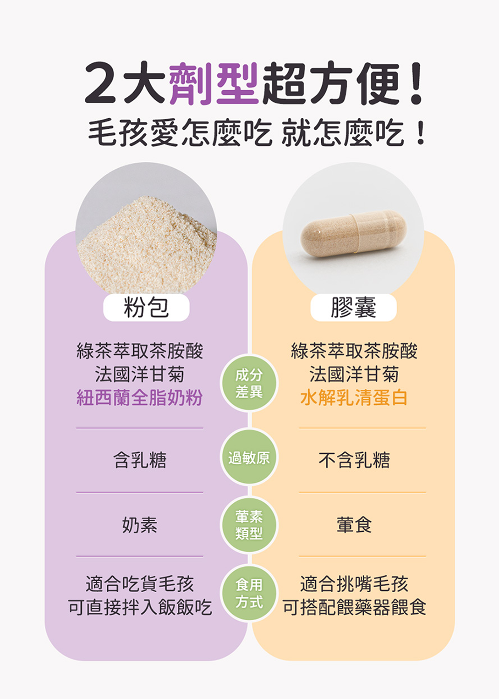 膠囊則是使用水解乳清蛋白,不含大分子乳糖,適用於腸胃不好及乳糖不耐的毛孩食用,膠囊為動物性成分,屬於葷食產品。