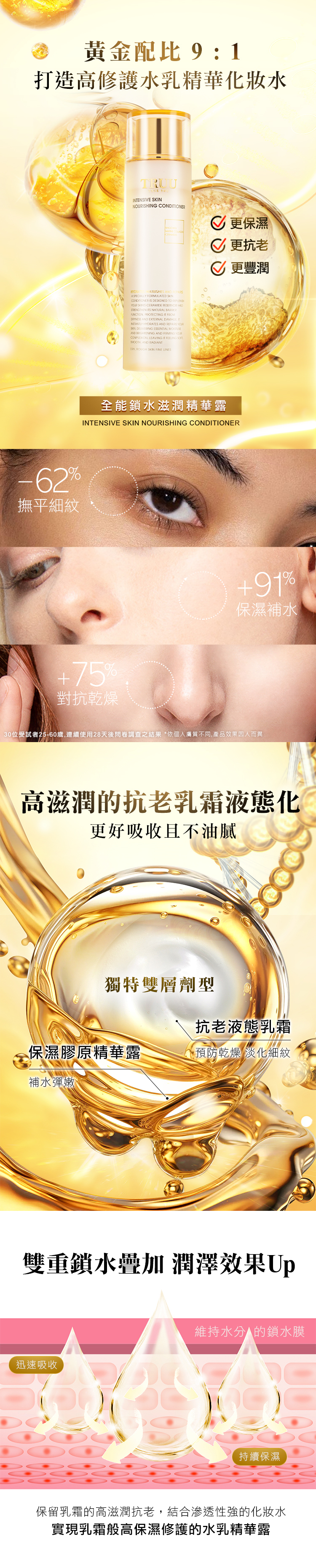 • 黃金9比1精華水乳配方,將高滋潤的抗老乳霜液態化,融入強效保濕的精華露中,分子更小迅速滲透卻不油膩,