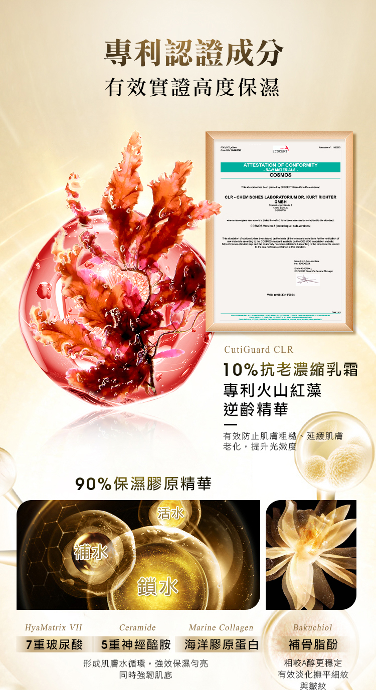 • 抗老液態乳霜富含專利逆齡精華與補骨脂酚,撫平細紋,重回年輕緊實飽滿。