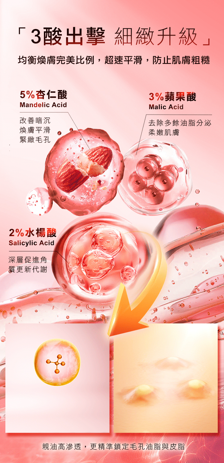 溫和有效成分,杏仁酸+水楊酸調理,有效煥膚不易刺激。